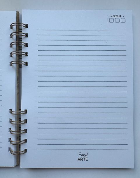 Cuaderno 15x21cm, con 60 hojas rayadas de 70g. Tapa en MDF con espiral doble metálico.
